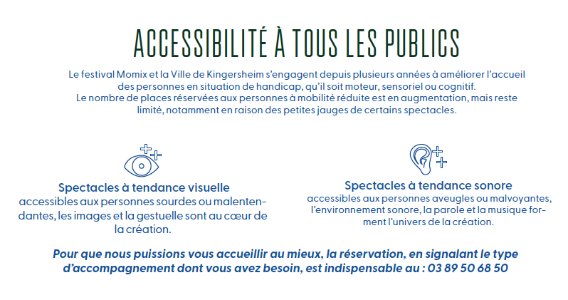 | AVANT LE FESTIVAL À PARTIR DU 5 DÉCEMBRE 14H Fermeture du CRÉA au public du 20/12/2025 au 5/01/2026 inclus | Ouverture de la billetterie en ligne : à partir du 5 décembre 2025 Vous pouvez aussi réserver vos places : par téléphone au 03 89 50 68 50 ou directement à la billetterie au CRÉA 27 rue de Hirschau – 68260 Kingersheim Pour toute question, veuillez écrire à : billetterie@momix.org Ouverture de l’accueil téléphonique Avant le festivalLundi : fermé Mardi à vendredi : 10h–12h / 14h–18h |